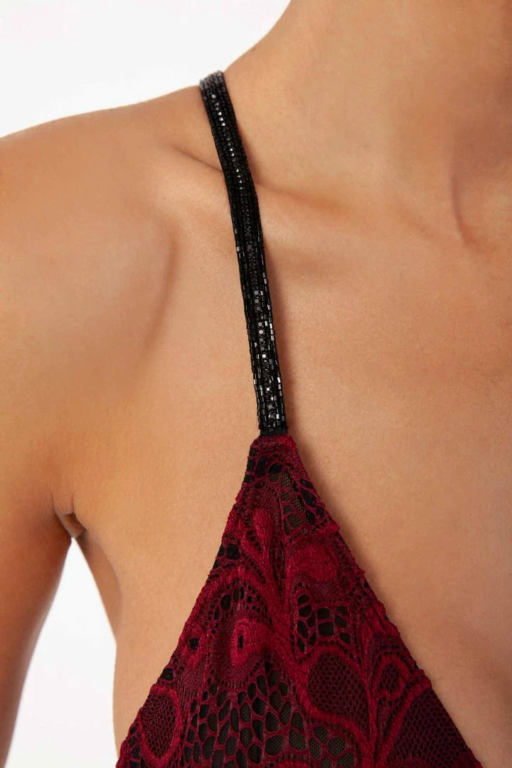 The Alexis Red Lingerie Set is made from red paisley lace locally sourced in Los Angeles, California. The bra features a soft elastic back and dazzling hand beaded straps in a unique X-back design. Paired with the Alexis Thong, which is lined in a soft stretch mesh with adjustable elastic for added fit and comfort.