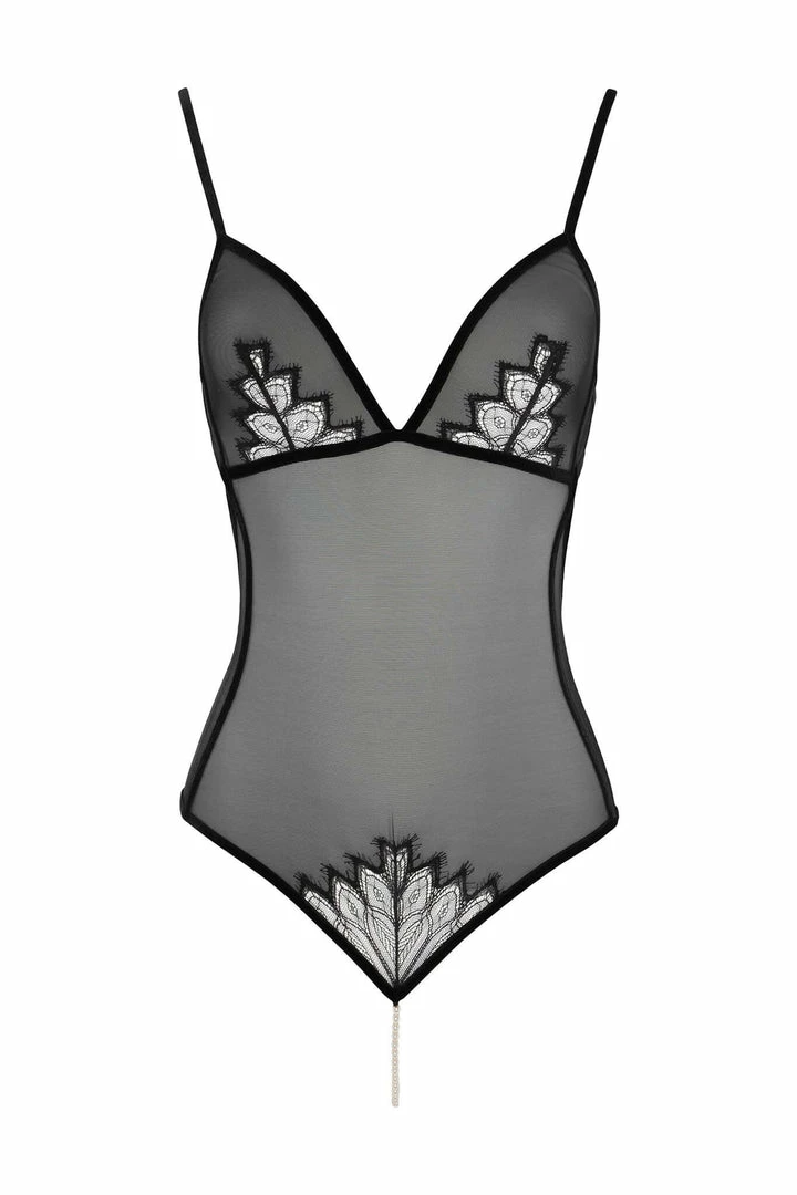 Inspired by the historical capital of Japan. Made with Leavers lace, elastic tulle and velvet. As with all Bracli pieces, the most provocative touch is the necklace made of a strip of pearls, which stimulates the most pleasurable parts of a woman.
