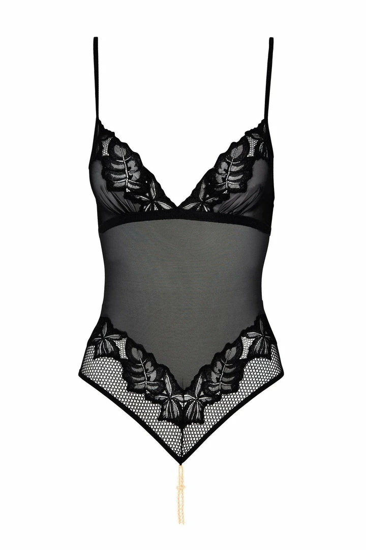 Bodysuit made with Leavers lace, tulle and gold components. The double strand of pearls is Bracli’s signature, with which you can get two different sensations: stimulation for women and both partners in a sexual relationship.The pearl ring should be moved until it touches the clitoris to caress it, and during penetration it will have an extra sensation when the penis passes through the opening formed by the two pearl necklaces.