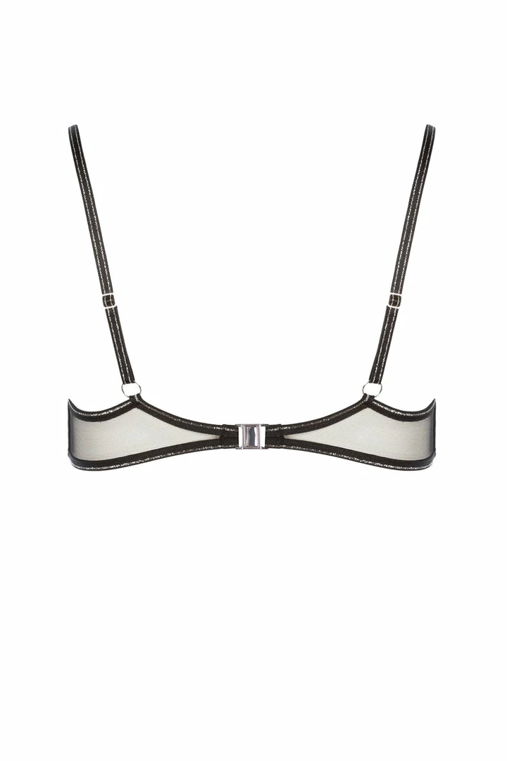 Bra made of recycled Italian lace, super transparent tulle, elastic silver lurex straps and silver appliqués. It has a suggestive design, leaving parts of the chest uncovered. Ideal to complement any of the thongs from the Manhattan Collection.