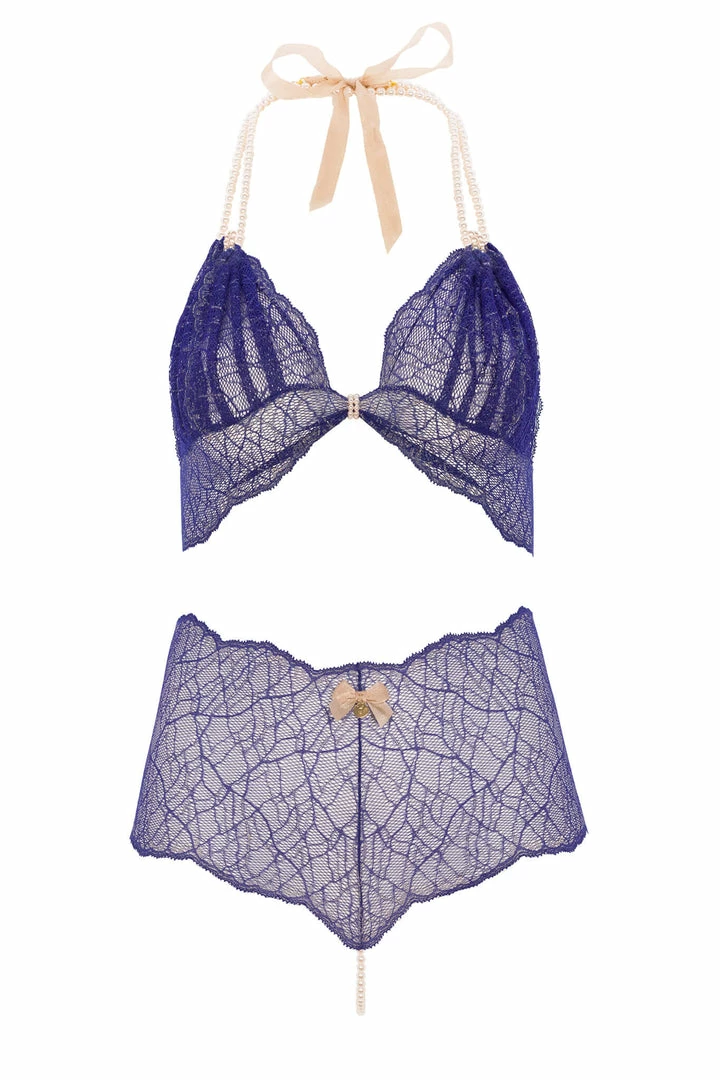 This is the Bracli’s proposal for the more exuberant blue lace pearl thong set. With a double pearl necklace, you will have double the enchantment.