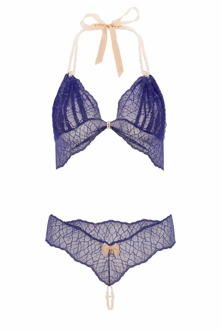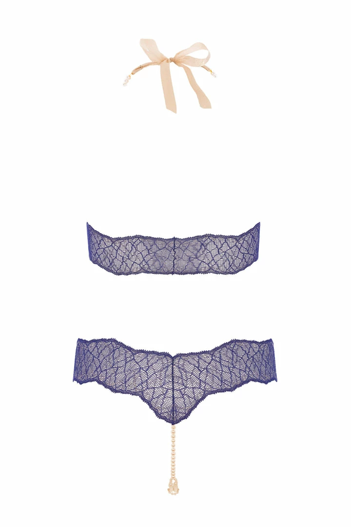 This is the Bracli’s proposal for the more exuberant blue lace pearl thong set. With a double pearl necklace, you will have double the enchantment.