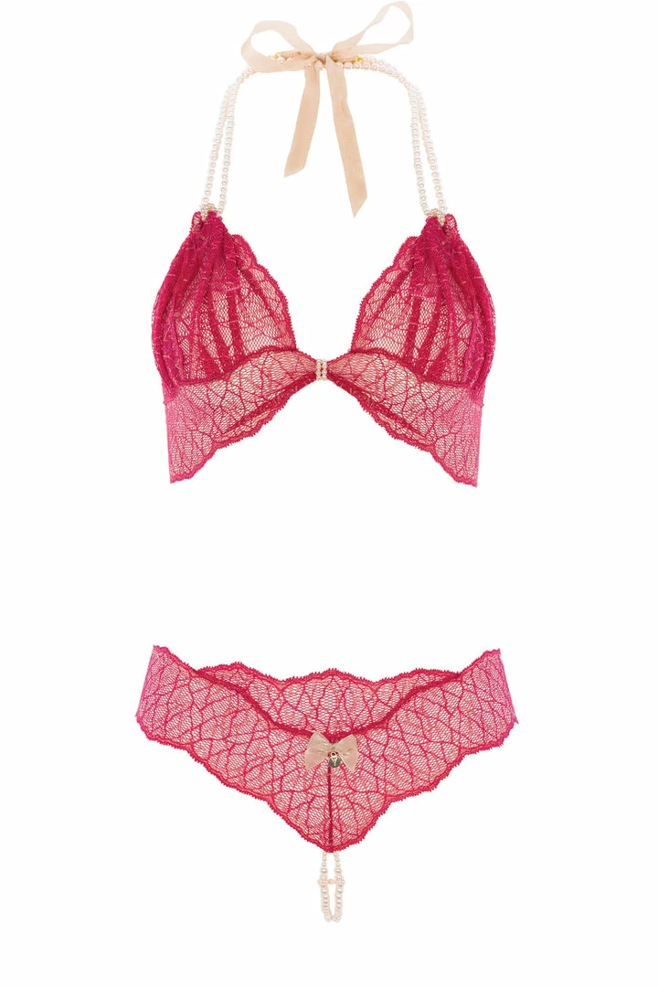 This is the Bracli’s proposal for the more exuberant red lace pearl thong set. With a double pearl necklace, you will have double the enchantment.