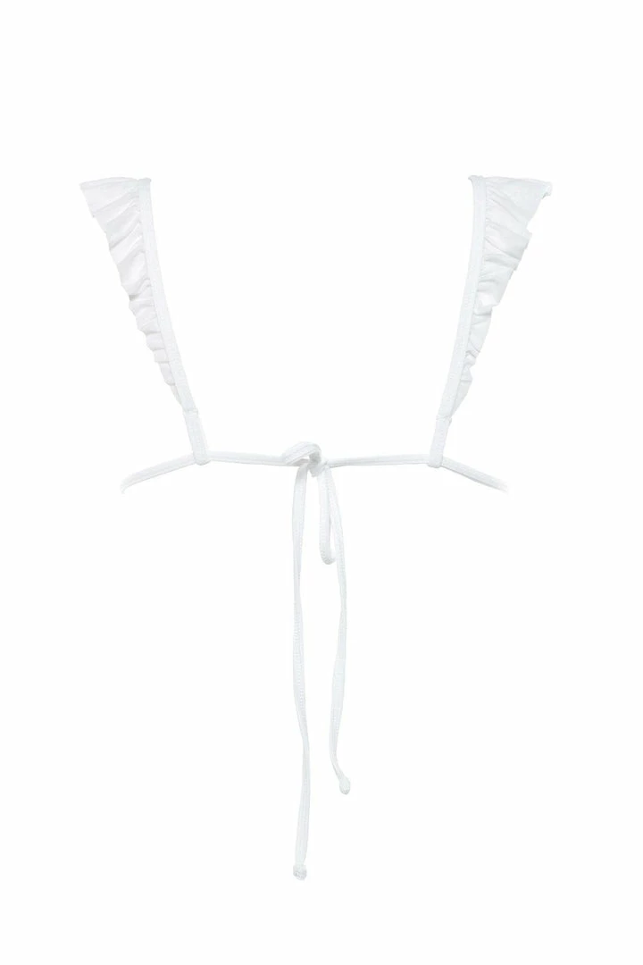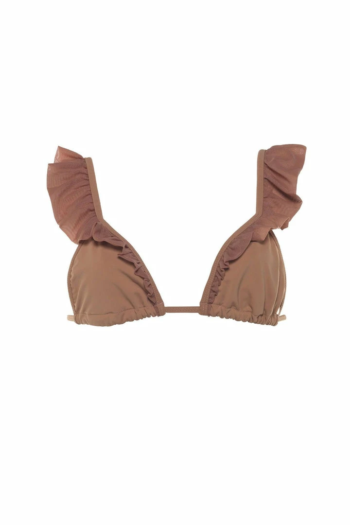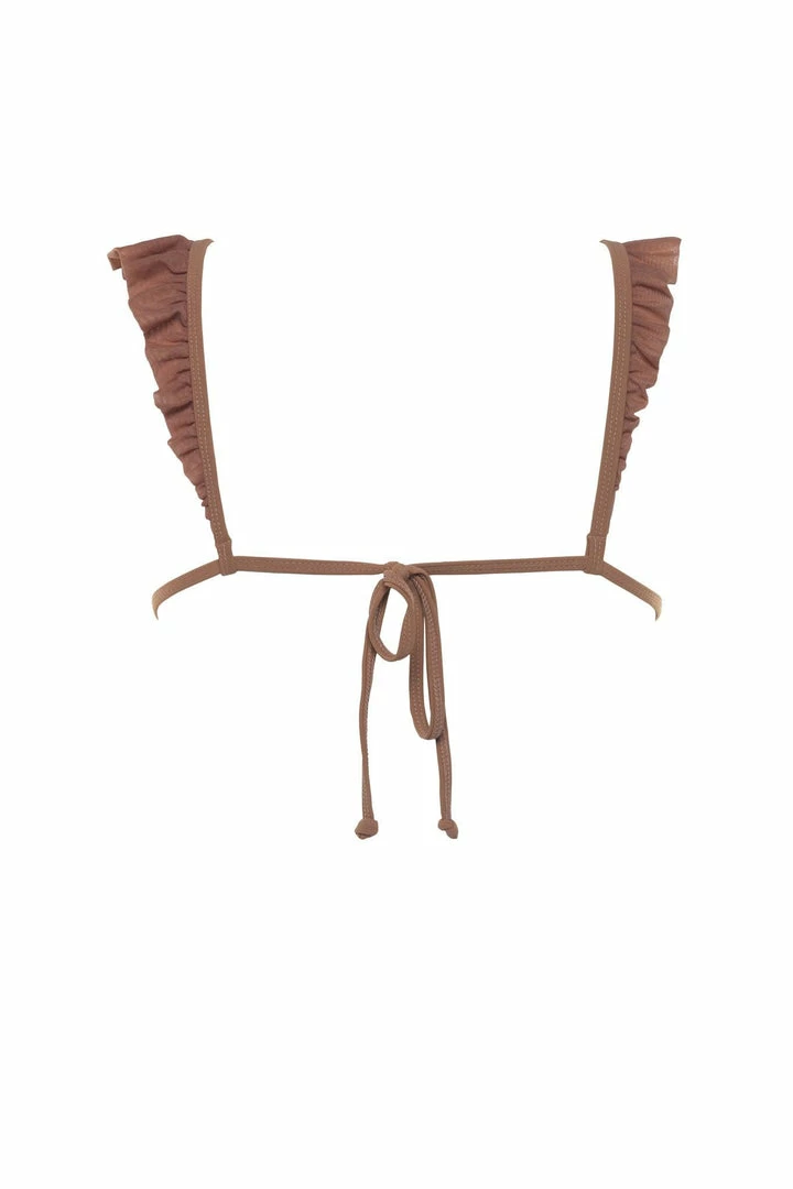 Flirty Feminine top with luxury mesh fabric ruffle accents. Adjustable slide back tie. The Rumi is designed with all the special events in mind from daytime at the beach or poolside at the resort, to night time dining and dancing.