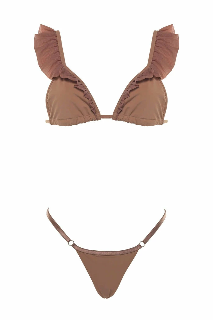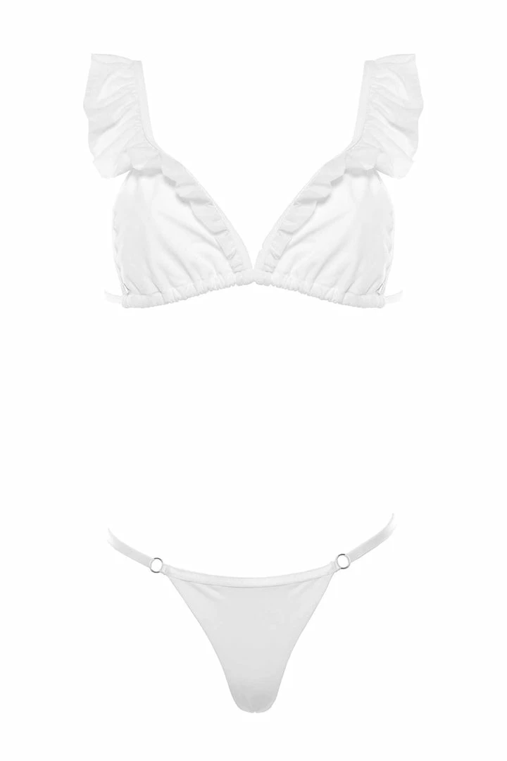 Flirty feminine bikini set with luxury mesh fabric ruffle accents. The Rumi Yohji Bikini Set is designed with all the special events in mind from daytime at the beach or poolside at the resort, to night time dining and dancing. A travel necessity for every destination. This design can be worn as lingerie or swimwear.