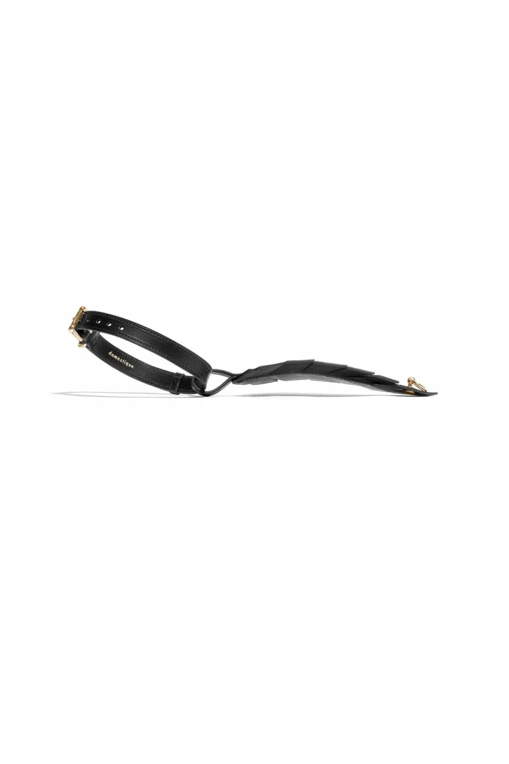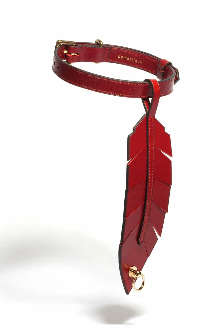 On a collar closed by an English buckle, a removable feather in natural tanned leather is secured. It’s a playful accessory: the feather can be worn both around the throat or the neck, it becomes a leash when attached to the Pinson Belt.