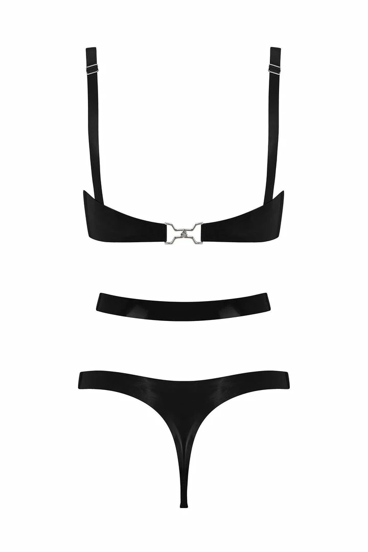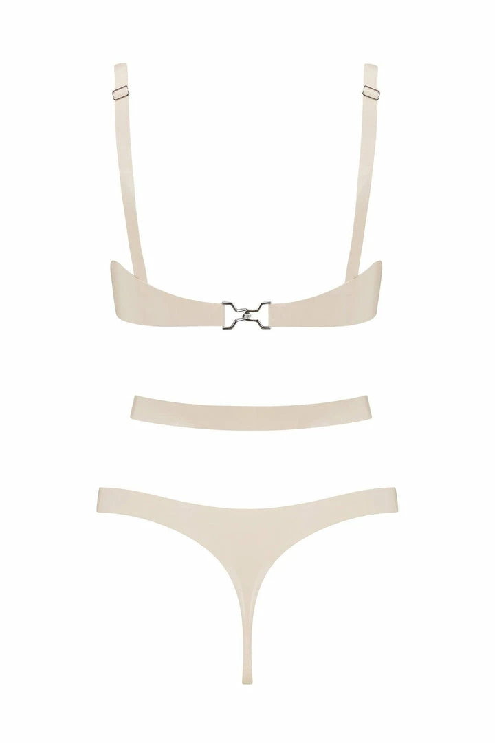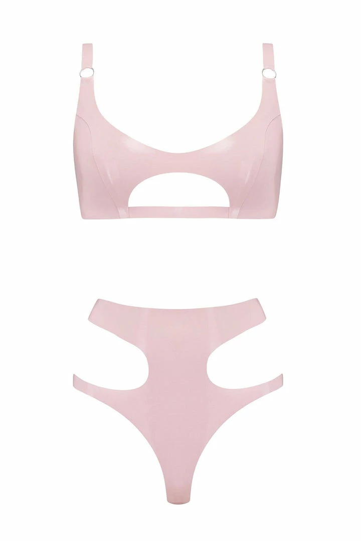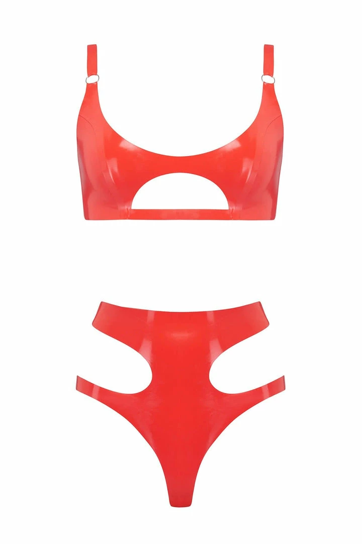 Featuring a cut out section to the front of the Bralette and side cutouts on the sides of the Thong, this latex lingerie set creates a beautiful shape in the wearer.