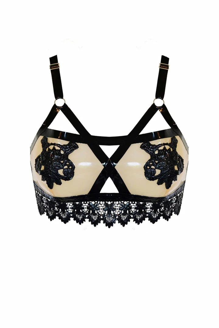 Effortlessly beautiful, our latex lingerie Maia Bralette creates a feminine take on the ever popular fetish trend. Fully adjustable strapping has been used throughout with a bold use of Lacetex® embellishment to the front with cut out bra cups. A strong empowering piece, which creates a lovely natural shape in the wearer.