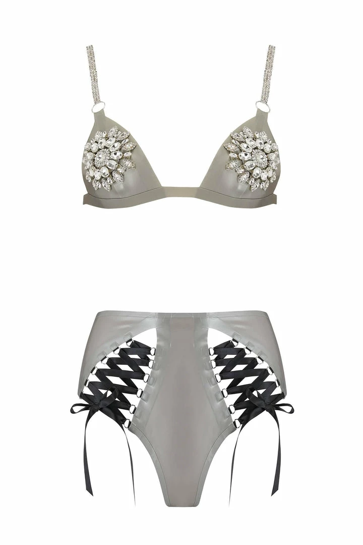 A Silver Latex Lingerie Set like you have never seen it before. Featuring two exaggerated diamanté appliqués to the Mu Triangle Bra, jewel bra straps to match, and the high waisted Lambda Knicker tailored to perfection.