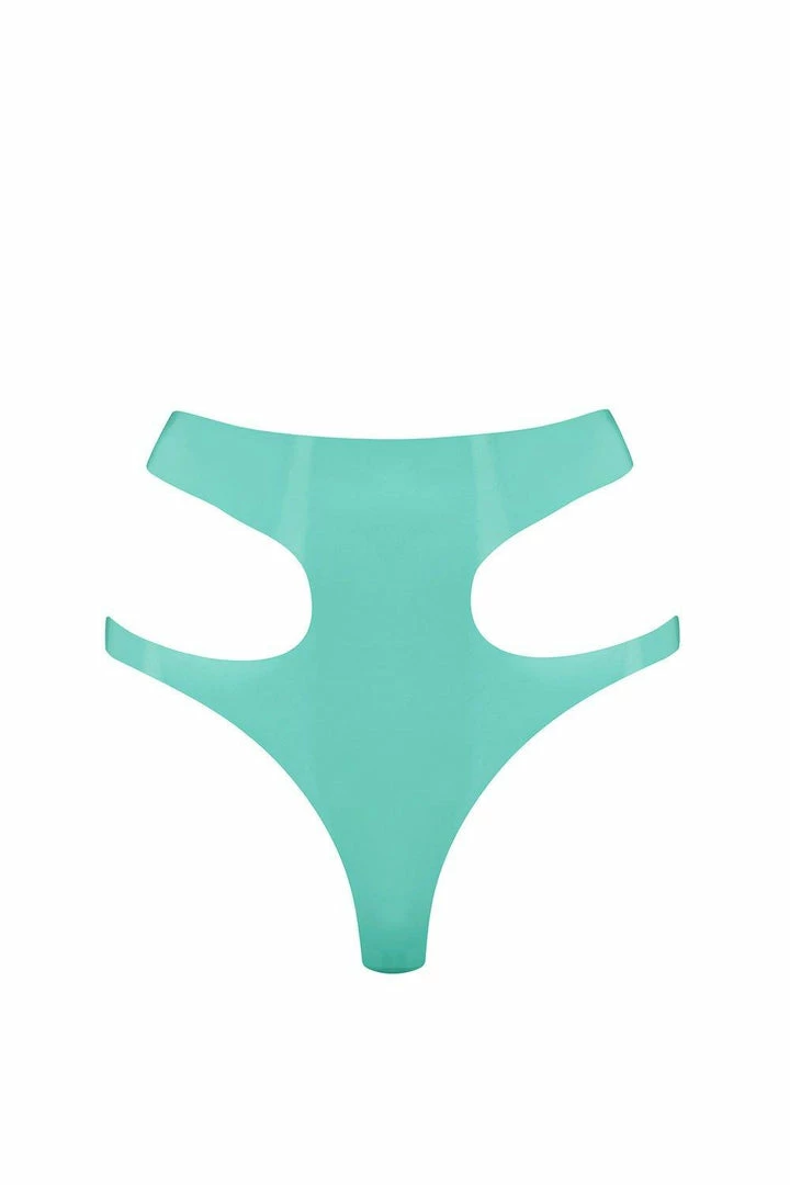 Sitting high on the waist, with cut out sections to the front and back, the Jade Green Latex Cut Out Thong’s striking design will hug you in all the right places. Pair with our range of bras to complete the look.