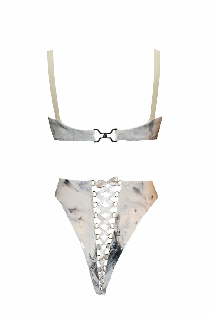 Naughty and nice, and all things right. The Papilio Alexis White Latex Set in Marbletex® offers a statement that won’t be forgotten easily. With gorgeous lace up panels, metal components and a branded buckle exclusive to Elissa Poppy, give that special someone something to unwrap, the ultimate present is you.