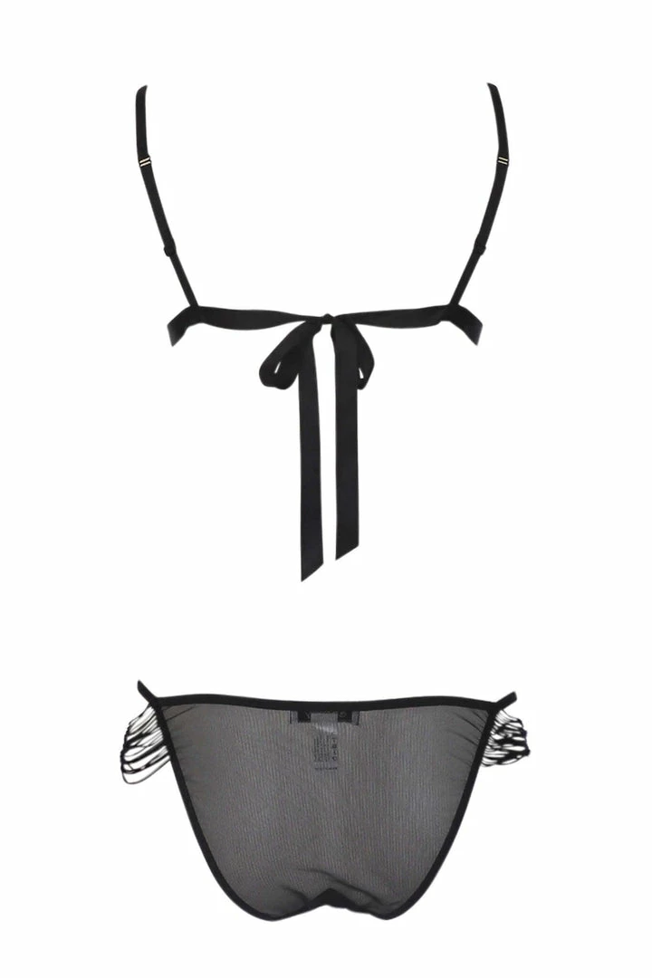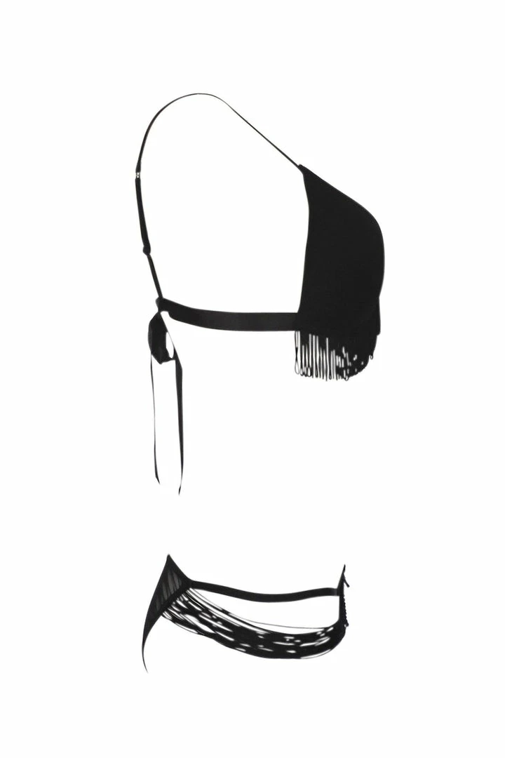 Black triangle cup bra without underwire decorated with a fringed border in the classic burlesque style. The bra is moderately padded, easy to close with a satin ribbon on the back, the straps are adjustable in length.