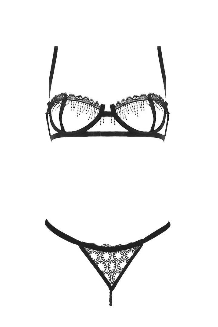 Black, ingeniously crafted, open bra with underwire in the balconette style. The bra is made of elastic bands and shows a lot of bare skin. The ribbon across the chest is a beautifully embroidered French style ribbon.