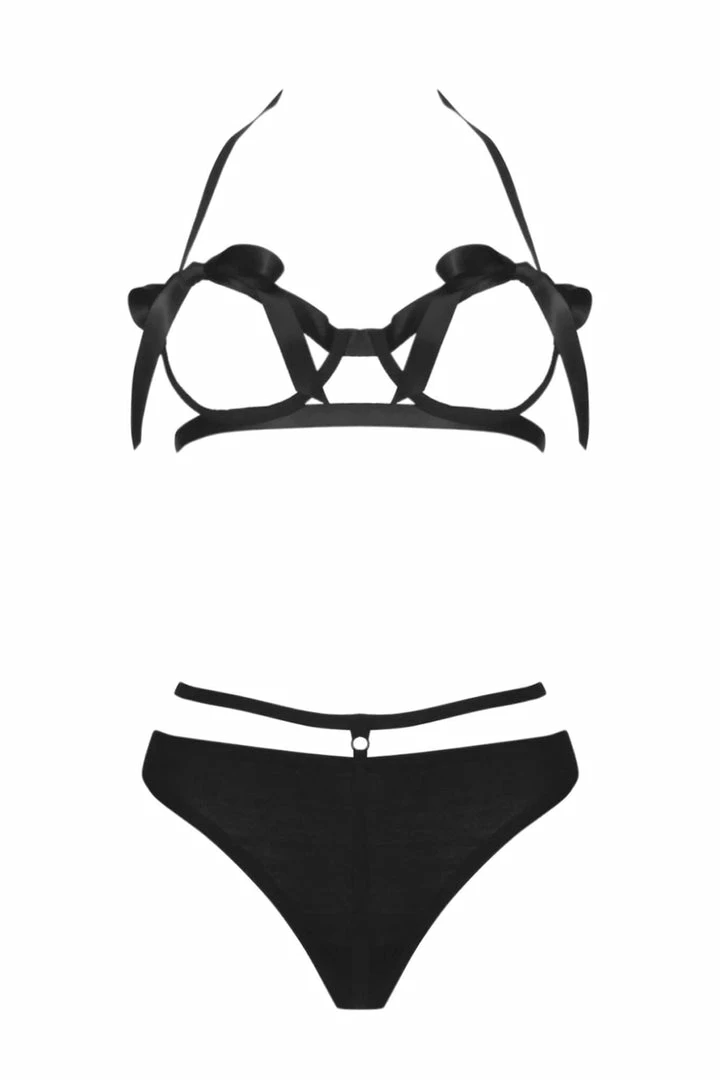 The nifty open underwire bra in the balconette style is made of elastic bands and shows a lot of bare skin. The satin ribbons over the chest are playfully closed with large bows and invite you to open them. The holder corner strap in the neck is adjustable in length.