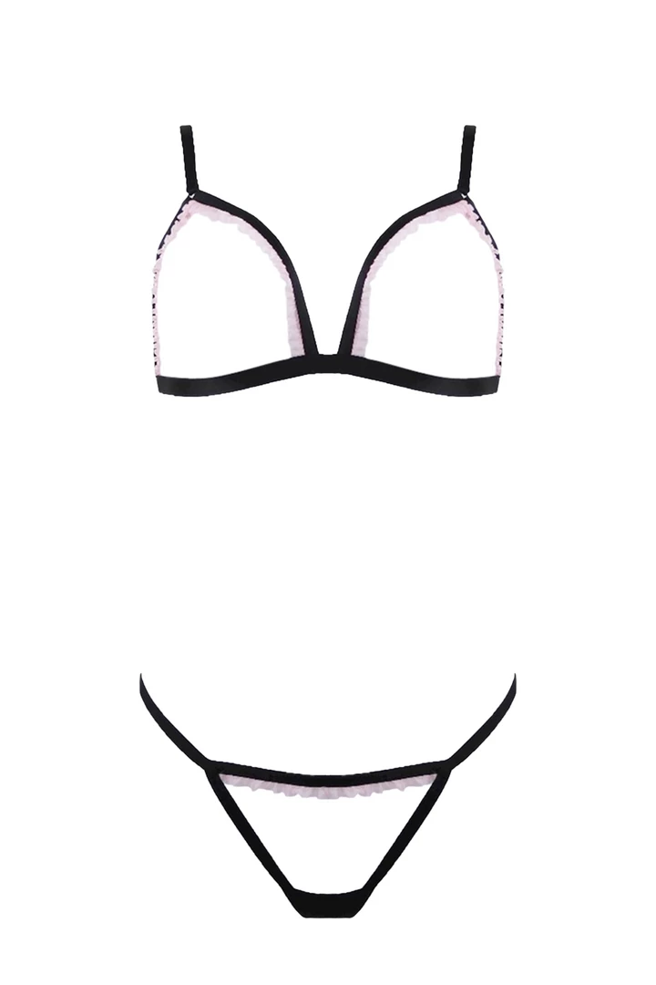 Refined open frame bra made of black elastic straps decorated with a particularly beautiful soft ruffle in pink. This bralette bra promises interesting moments in pairs and is guaranteed to make the temperatures rise! After ordering, the bra is made in our studio in Berlin.