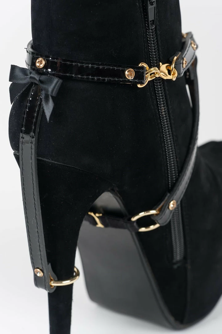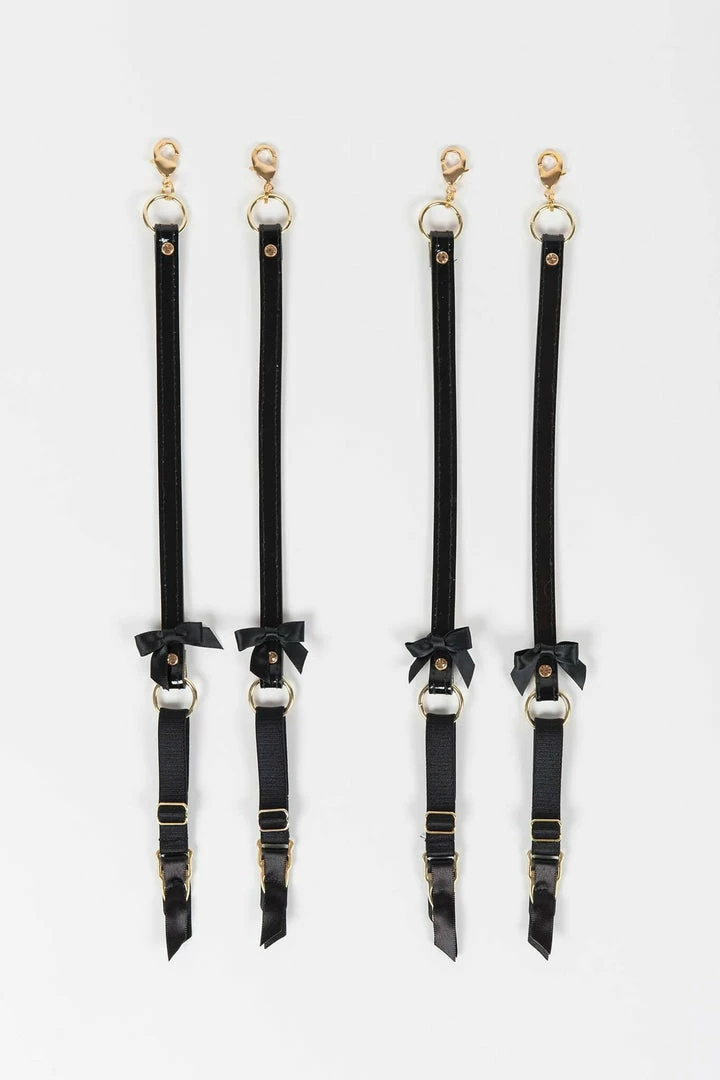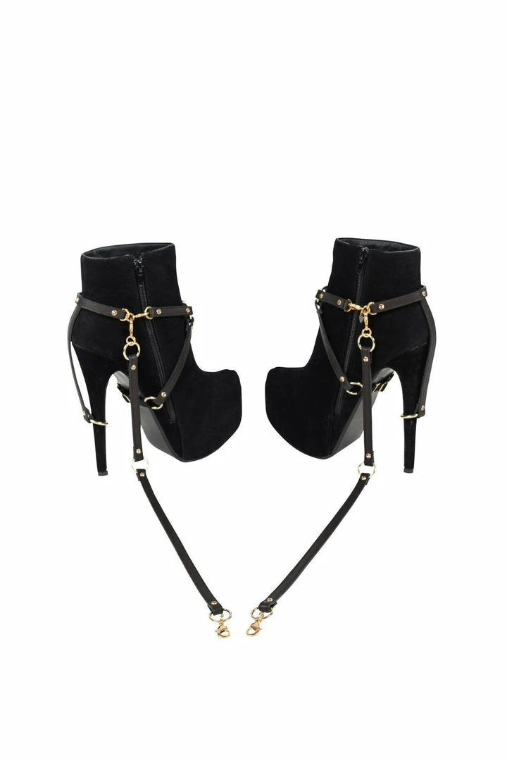 Make the perfect transition from the dance floor to the bedroom. Pair with your favorite high heels or stiletto boot. Featuring detachable leather ankle restraint leads so your lover can restrain you to a chair or the bed! Detachable leads can also be used separately as handcuffs. These sexy cuffs are an absolute must have!