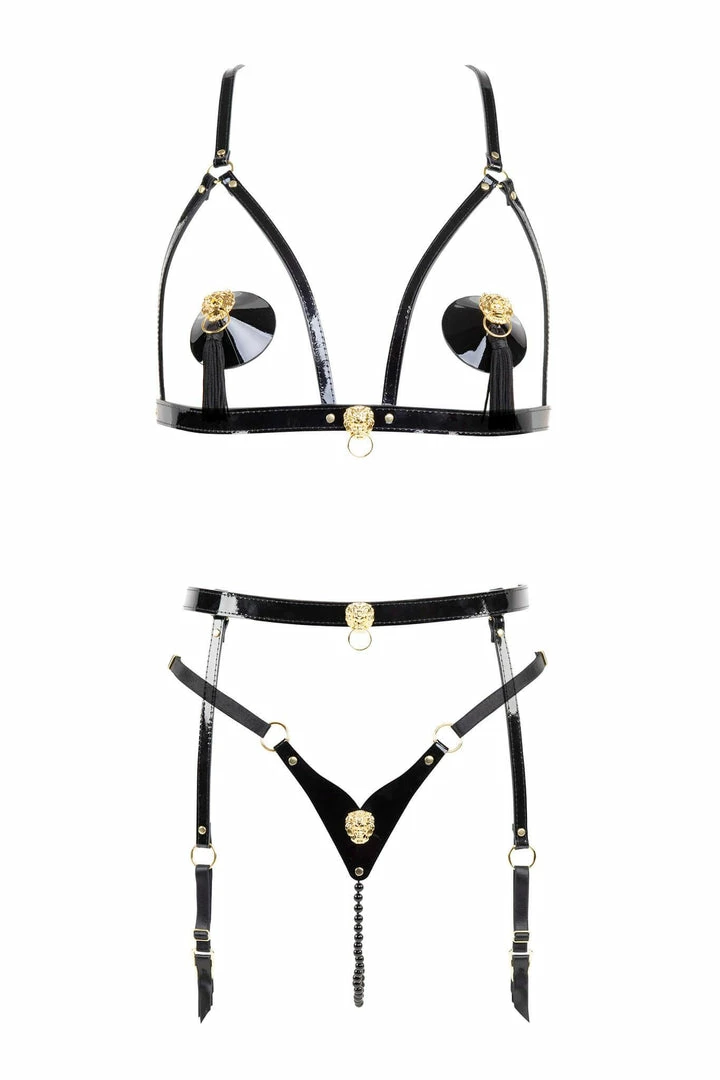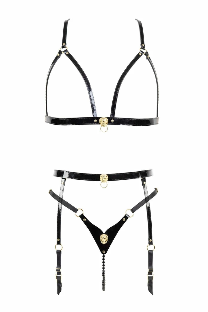 The ultimate sensual pearl string lingerie set! Our Leone Leather Pearl String Set is handcrafted from Italian black patent leather, features gold lion head accents and gold rivets.