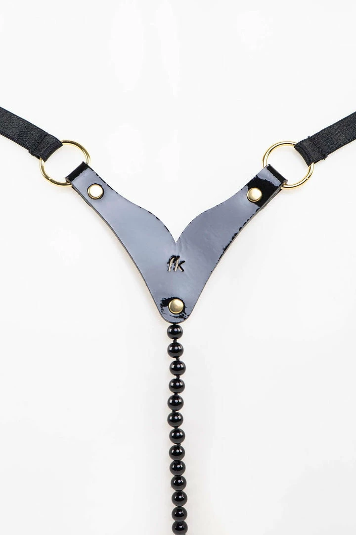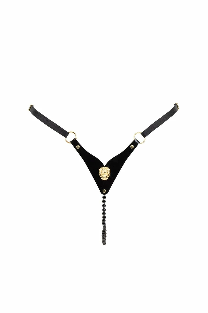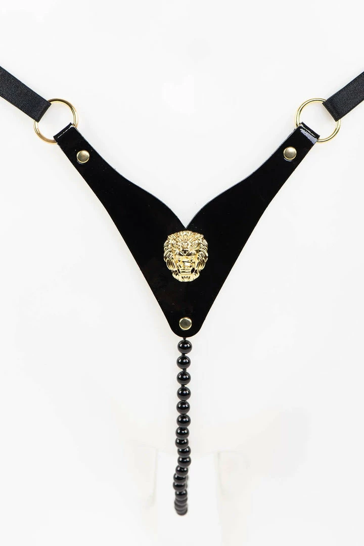 The ultimate sensual string! Our Leone Pearl String is handcrafted from Italian black patent leather, features a gold lion head and gold rivets. The luxurious center string is made from a strand of black glass pearls and adjustable double face satin elastic sides for easy size adjustments. Guaranteed to stimulate your senses!