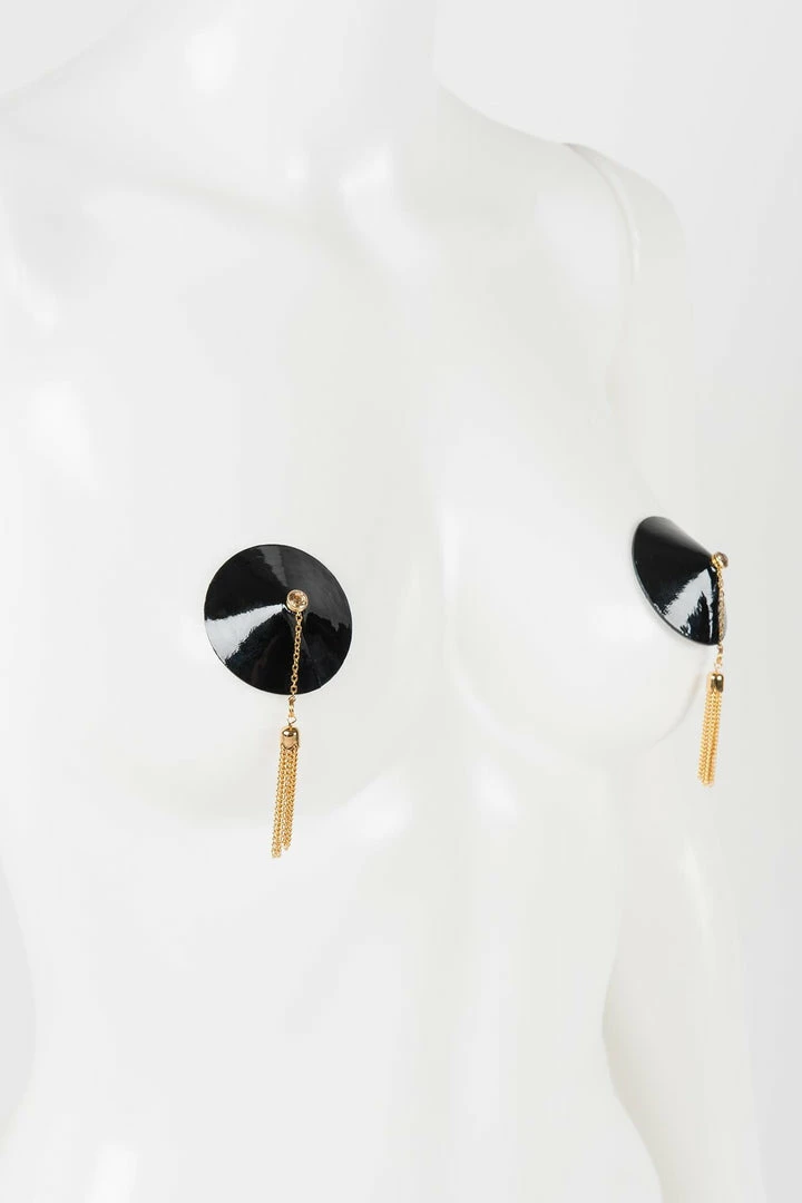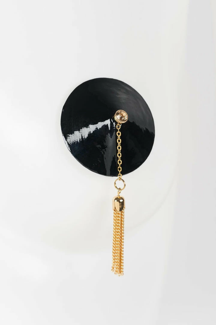 Our seductive Jet Patent Crystal Chain Tassel Pasties will make you the ultimate object of desire. Featuring Ultra-Chic gold crystal rivet & chain trimmings. These pasties guarantee you reign supreme in the bedroom.