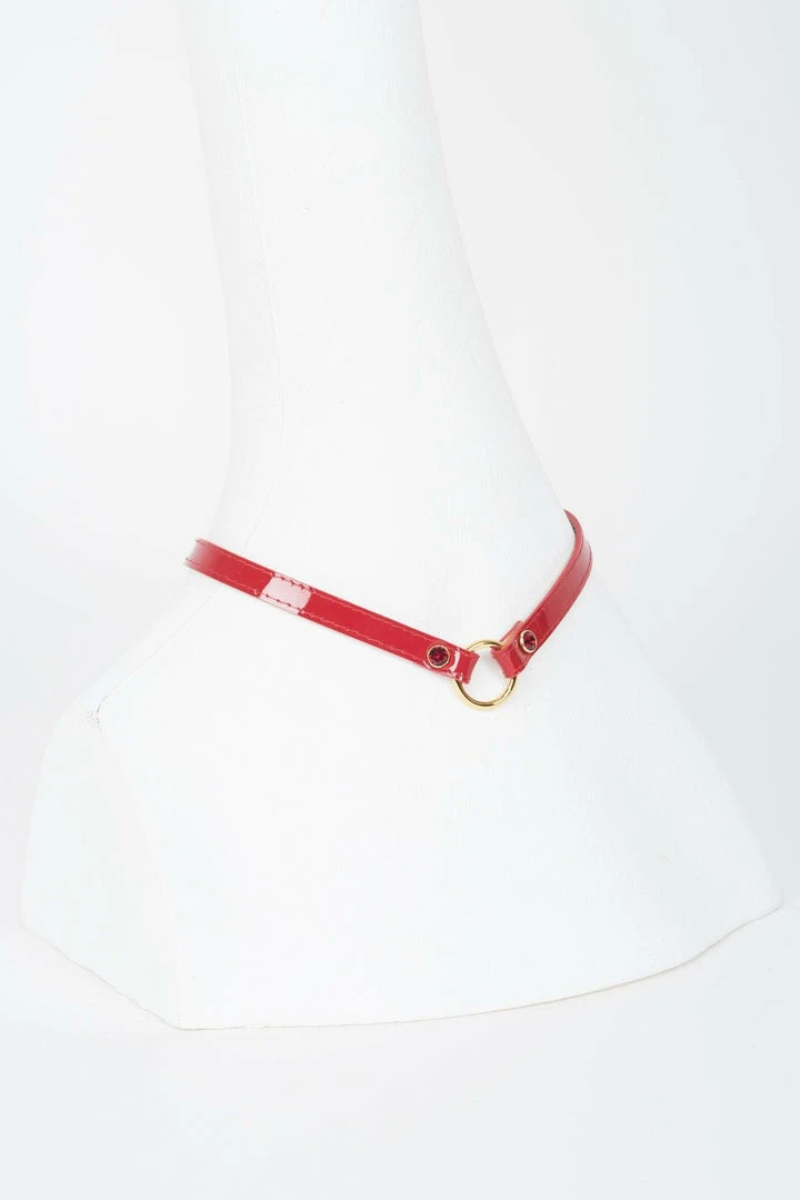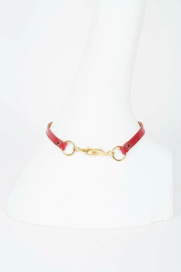 Handcrafted to order in our Berlin atelier, our Red Skinny Collar is perfect to add a touch of high fashion glamour to your favorite outfit or for erotic role-playing inside the bedroom. Featuring shiny red patent leather, 18K gold trims and Swarovski® crystal rivets. This is the ideal jewelry statement piece.