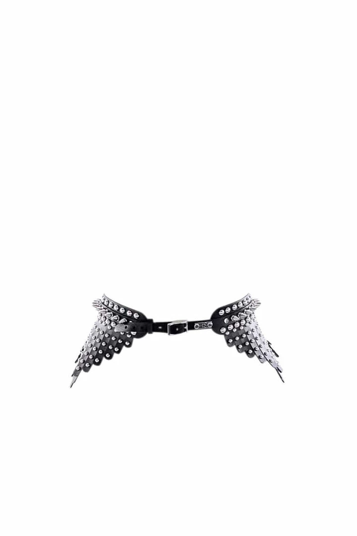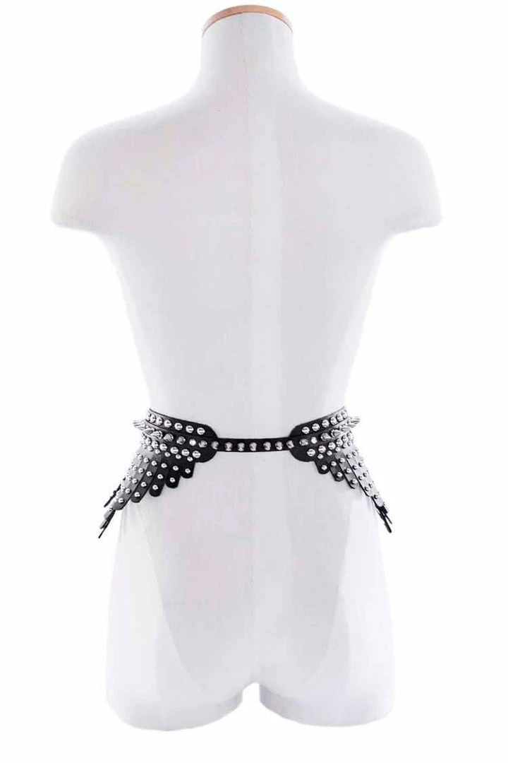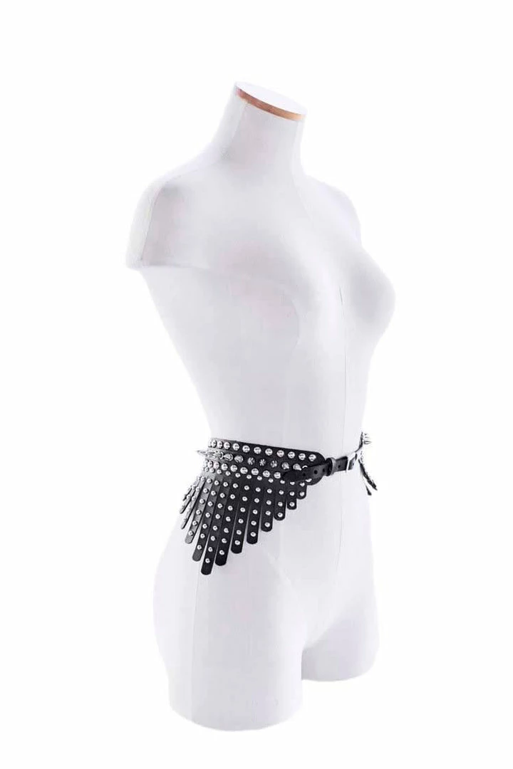 The Stella is inspired by the heavily gilded armor worn throughout the 14th century. This Peplum Belt features embellished leather falls, and a fully spiked waist band. This piece elevates the style of your little black dress, or shines on its own.