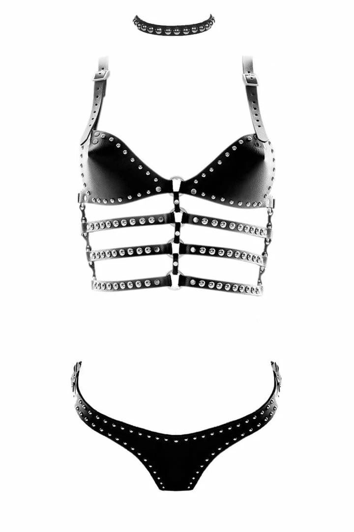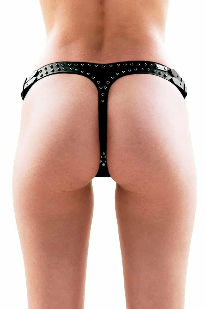 The Zeppelin Leather Bra features full cups and adjustable under bust, waist, and shoulder straps to ensure a comfortable fit. Matched with the the Zeppelin Leather Thong, a skimpy cut panty that frames the booty in all the right places. It sits low on the hips and fastens with four adjustable buckles to fit a wide range of sizes.