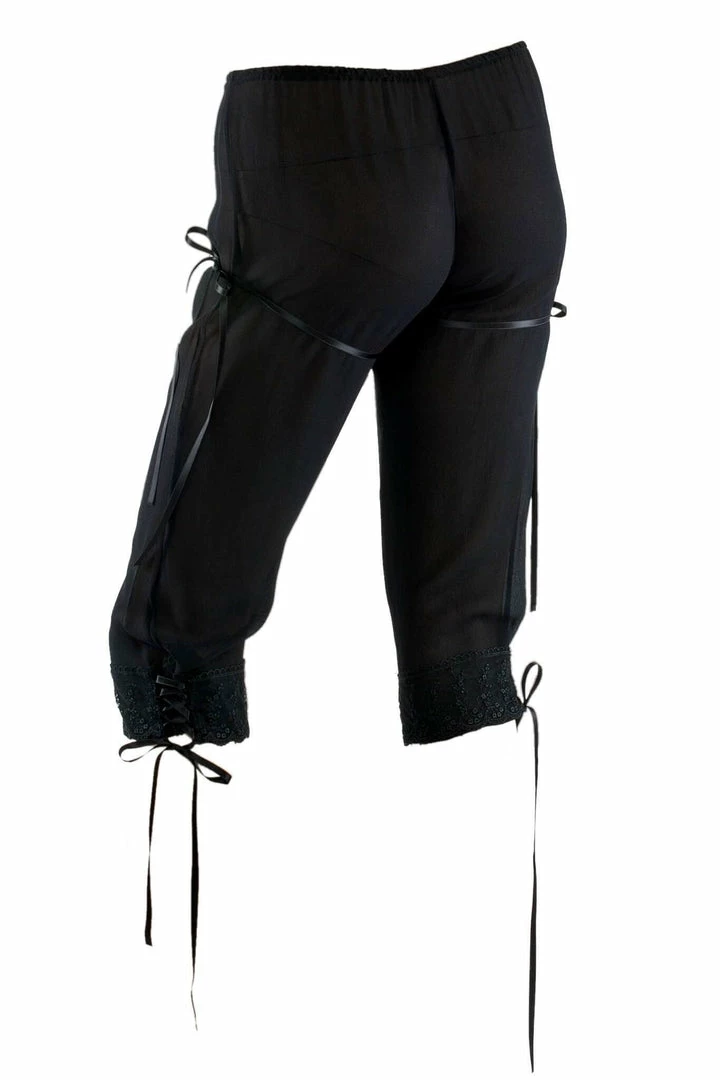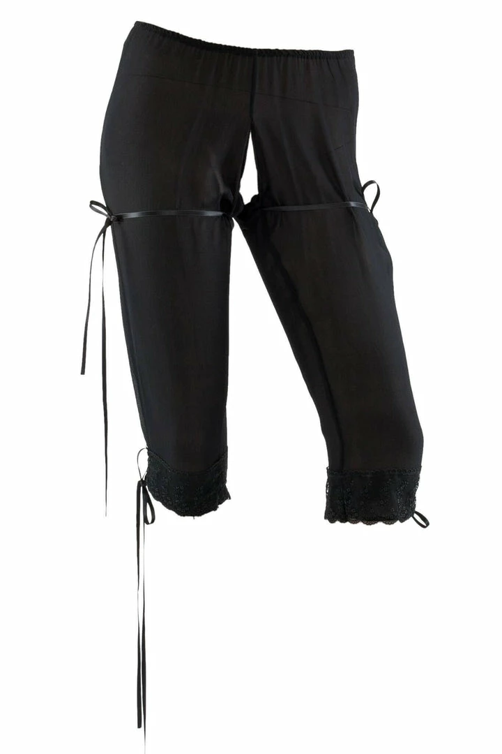 Cropped length leg bottoms in organic silk chiffon with a gliding elasticated waistband. Overlapped & Tied model featuring satin ribbons to be tied around the thighs at the base. Finished over the knee with a romantic floral embroidered lace frill retro style, laced up with handmade scallop stitched eyelets and soft satin ribbons.