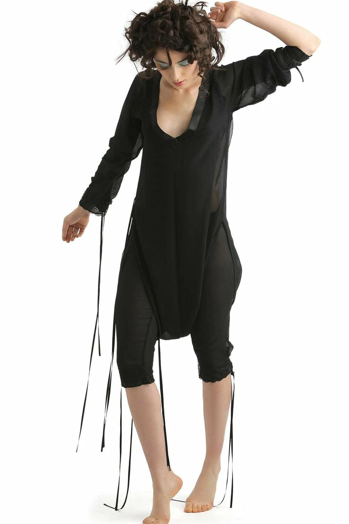 Unique, overlapped designed negligè in black organic pure silk chiffon, with the low décolleté finished in a black satin band. The symmetrical panels softly drape to caress and wrap around the thighs.