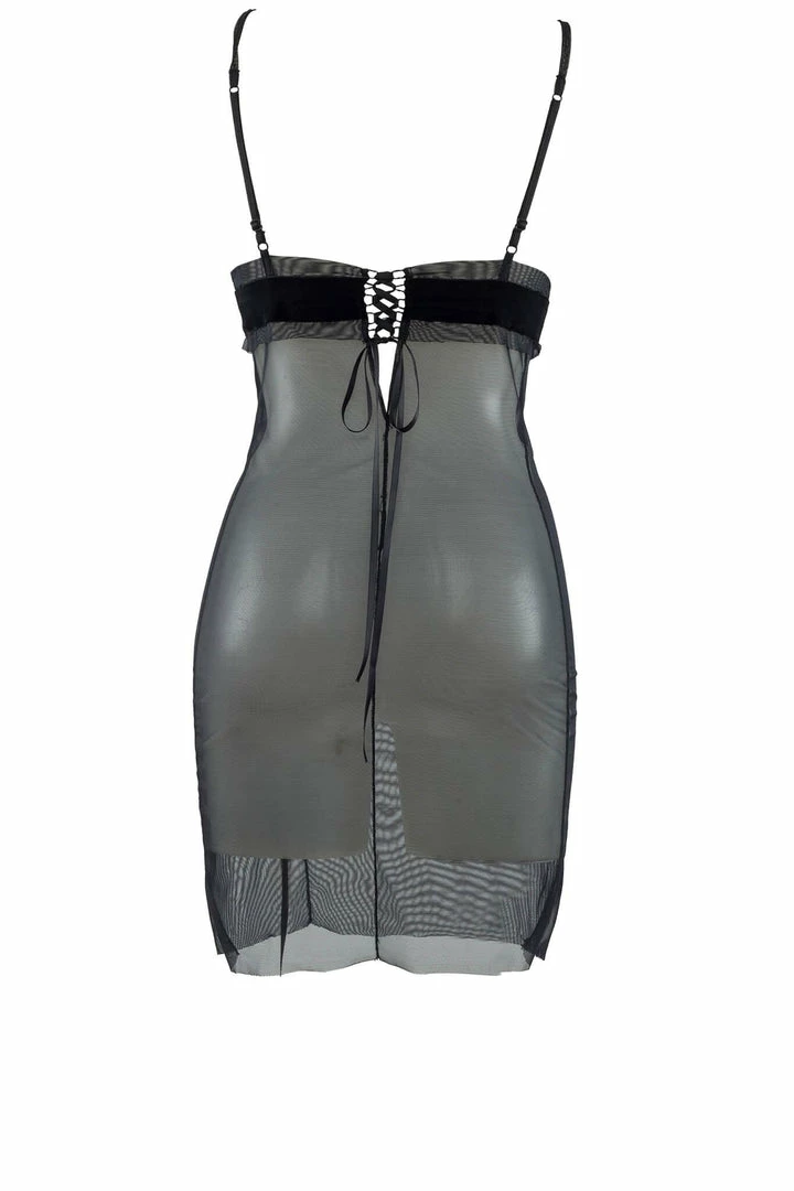 Underdress slip in soft elasticated high-strength tulle, featuring a wide black velvet ribbon on the underbreast line. Retro style back lacing made of handmade scallop stiches eyelets with satin ribbons.