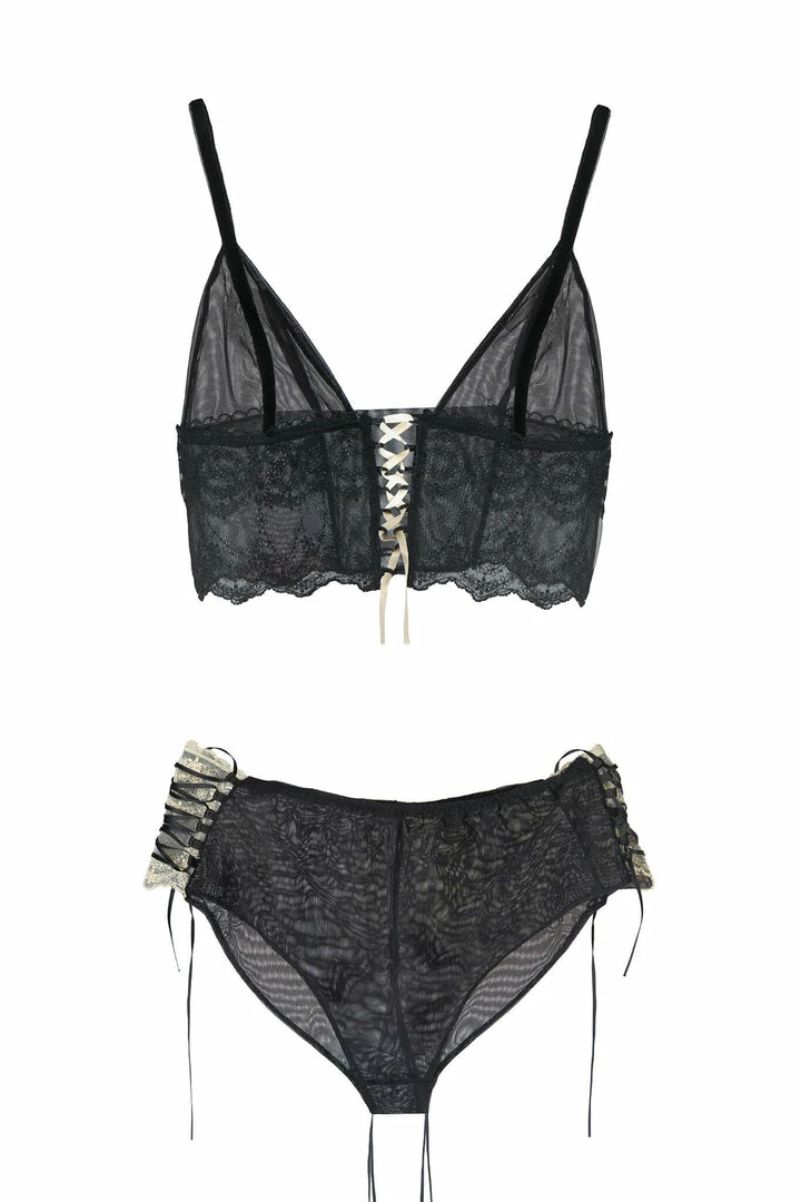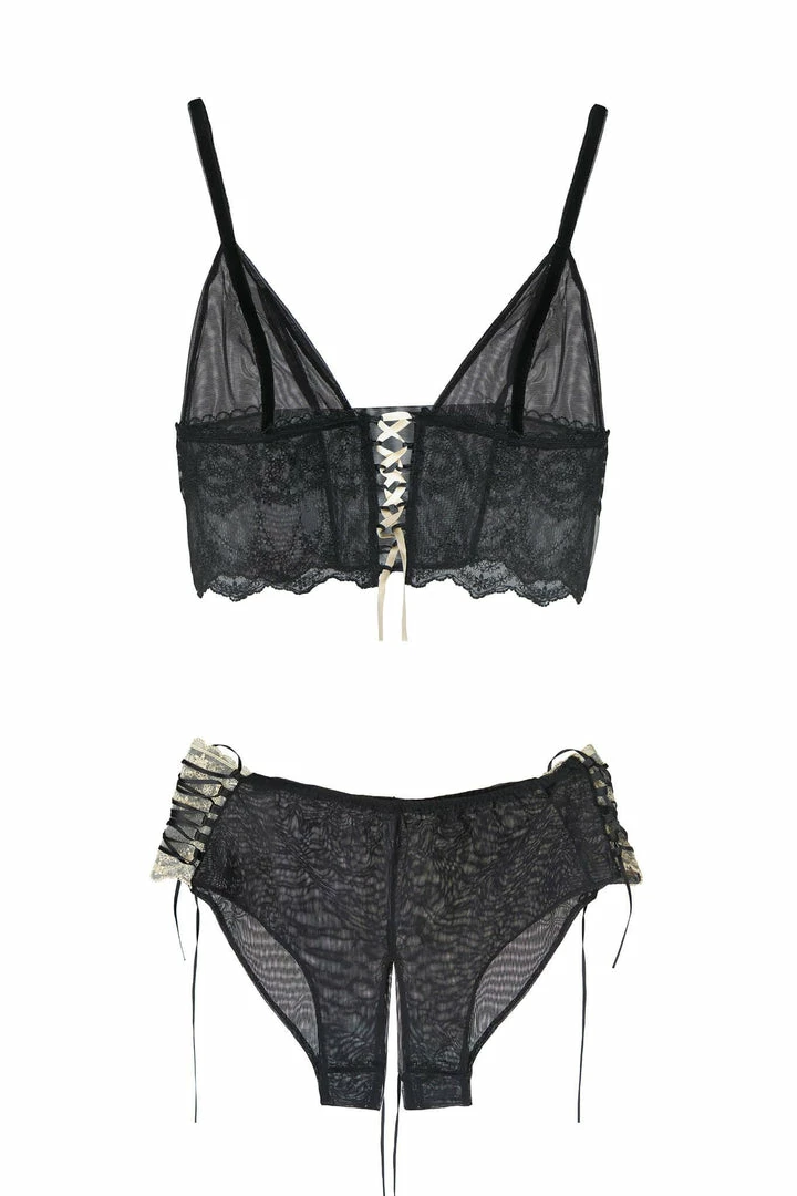 Inspired by the intricate patterns of Barocco age, the sheer lingerie set is defined by corsetry-inspired lace-up details for an irresistible allure.