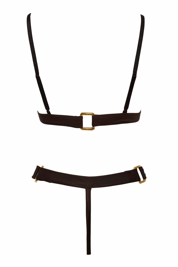Distinctly elegant aesthetic with basic and straight-cut structure. The iconic Hot Couture T style thong is super high-wasted, slimming thighs and hips for a leg-lengthening effect; detailed with sophisticated graphic design brass buckles, this bikini allows for the hips total tan, enhanced by the golden rays reflected by the golden metal.