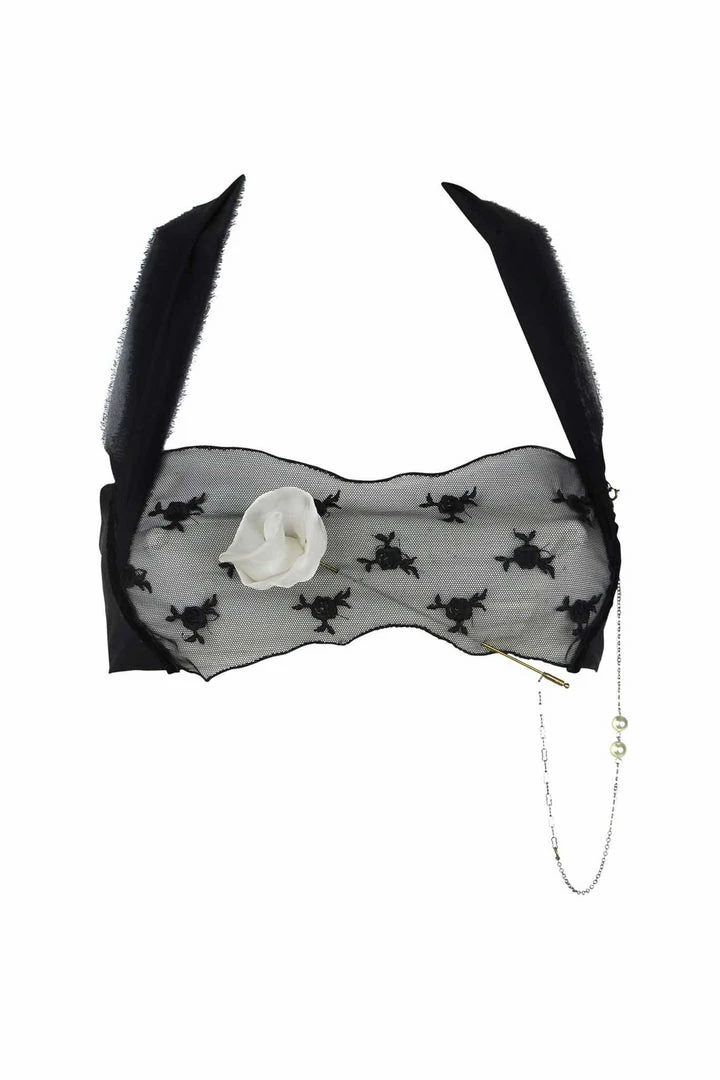 An elegant, ultra-feminine creation thanks to the stretch tulle band, embroidered with overlaid delicate roses which allows a captivating glimpse of décolletage, giving way to a very sensual effect. Featuring the pin brooch it turns into a super charming outfit, even with the most basic day jacket. Part of the Malena Haute Couture Lingerie Set.