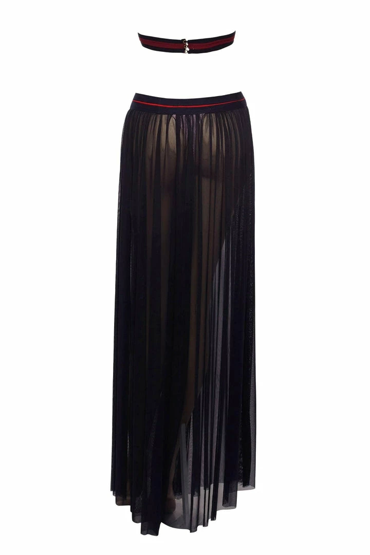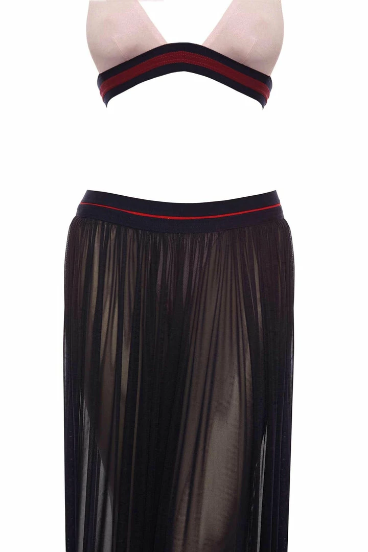 The innovative, unique on-the-cup hole adjustable lacing allows for the front, easiest fastening ever; the skirt is cut from light and fluid, extremely ultrahydroproof viscose “dry-as-out”. The draped style and low crotch offer maximum freedom of the legs while veiling.