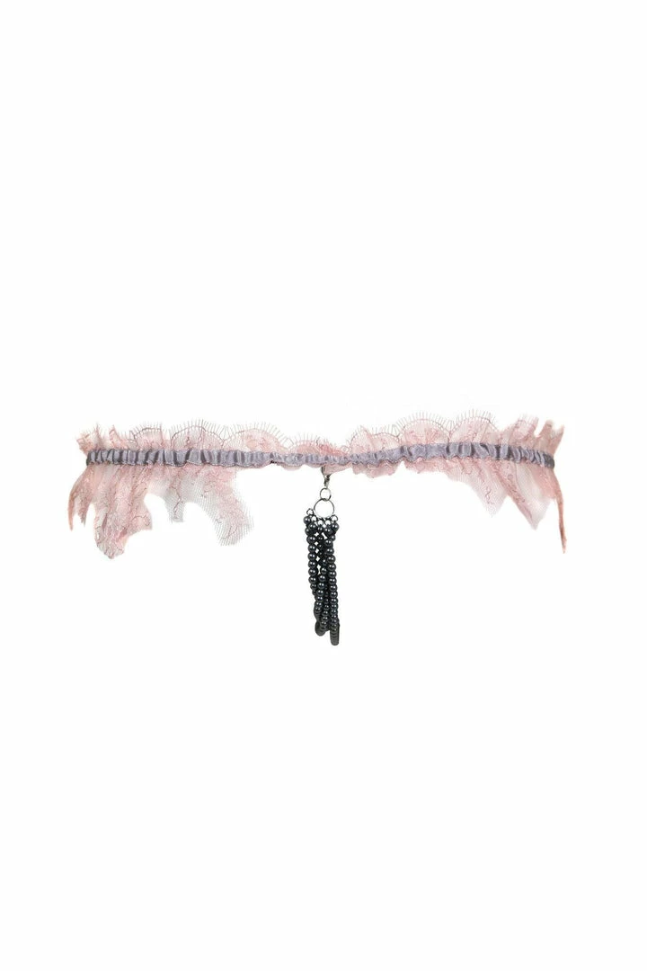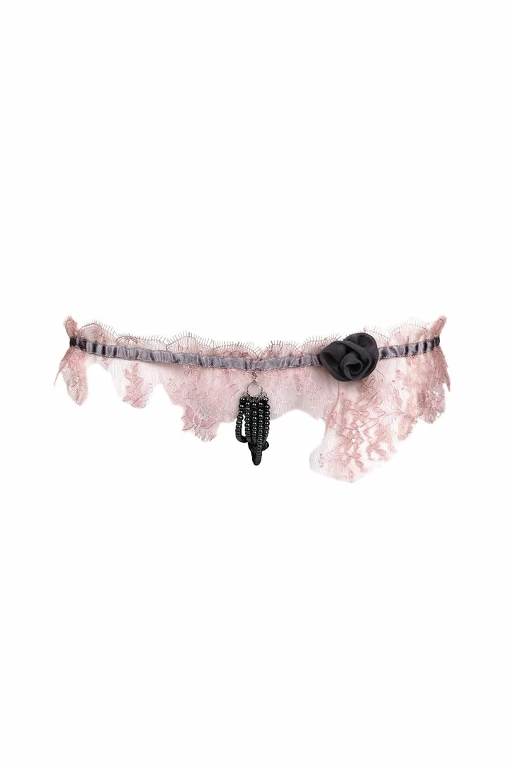 A sheer, exquisite brief in a Brazilian thong cut, expertly crafted with signature Italian craftsmanship from the finest Italian Chantilly lace. Handmade chiffon rose and satin evocate ancient splendors while crystals fall in striking dark-grey lights.