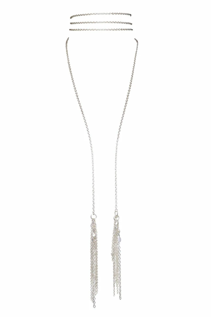 Bohemian meets elegance with this versatile lariat-wrap necklace. Wrap yourself with over five feet of sterling silver with two silver fringe tassels, either as a necklace or around your waist as a stylish belt.