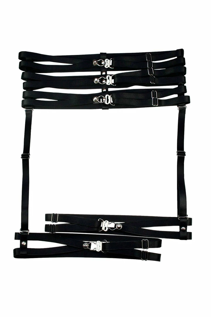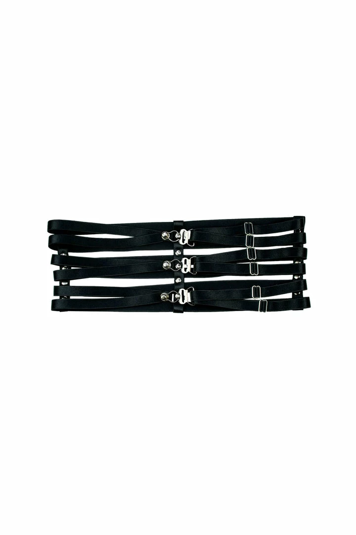 Satisfy that desire for more with a truly unique and decadent experience in Lalita’s exclusive Body Garters. Fully adjustable, the body garter wraps you in a custom embrace of six lengths of elastic and three silver garter closures. Enjoy this one-of-a-kind piece pressed against your skin or atop your clothing in a bold statement.Â