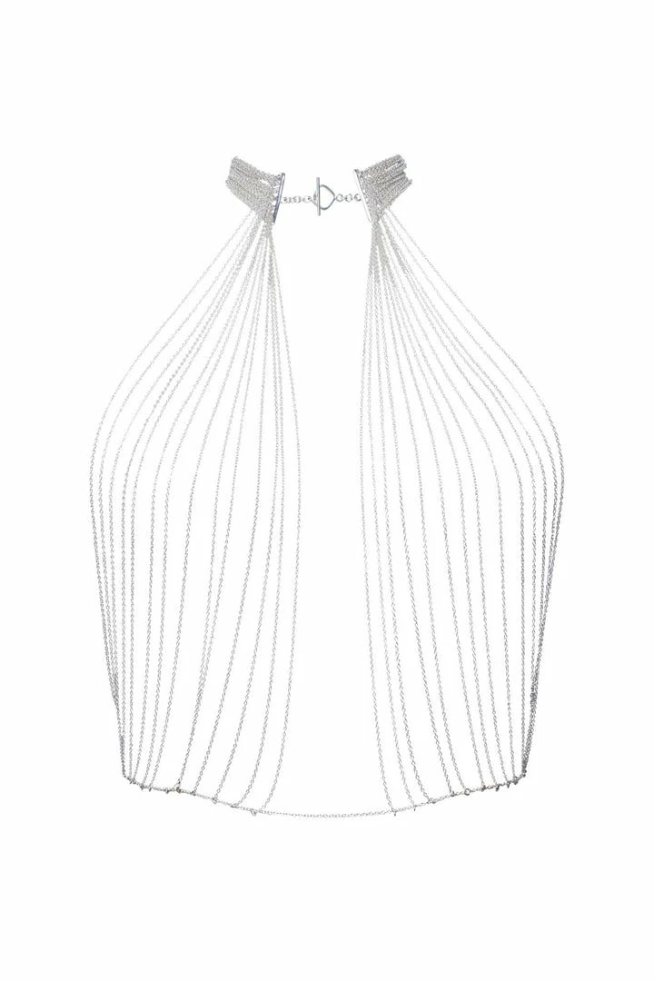 Adorn yourself in the epitome of delicate decadence in Lalita’s made-to-measure Sterling Body Chain. Designed and handcrafted for the individual, sixty-five (65) feet of sterling silver chain is wrapped, hung, and draped from an extravagant silver choker and secured at the waist.