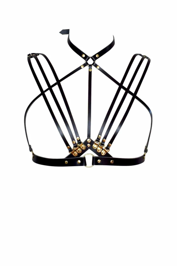 A complex but delicate looking strappy leather harness bra made from black leather and gold hardware. Made to order with custom sizing available.