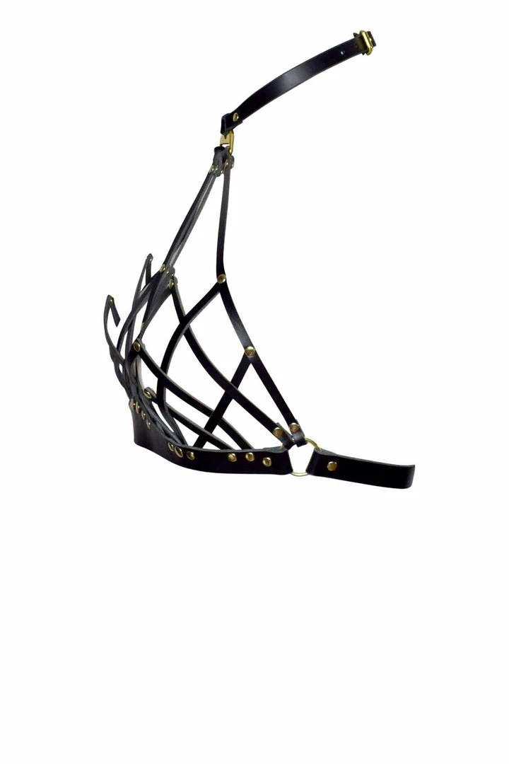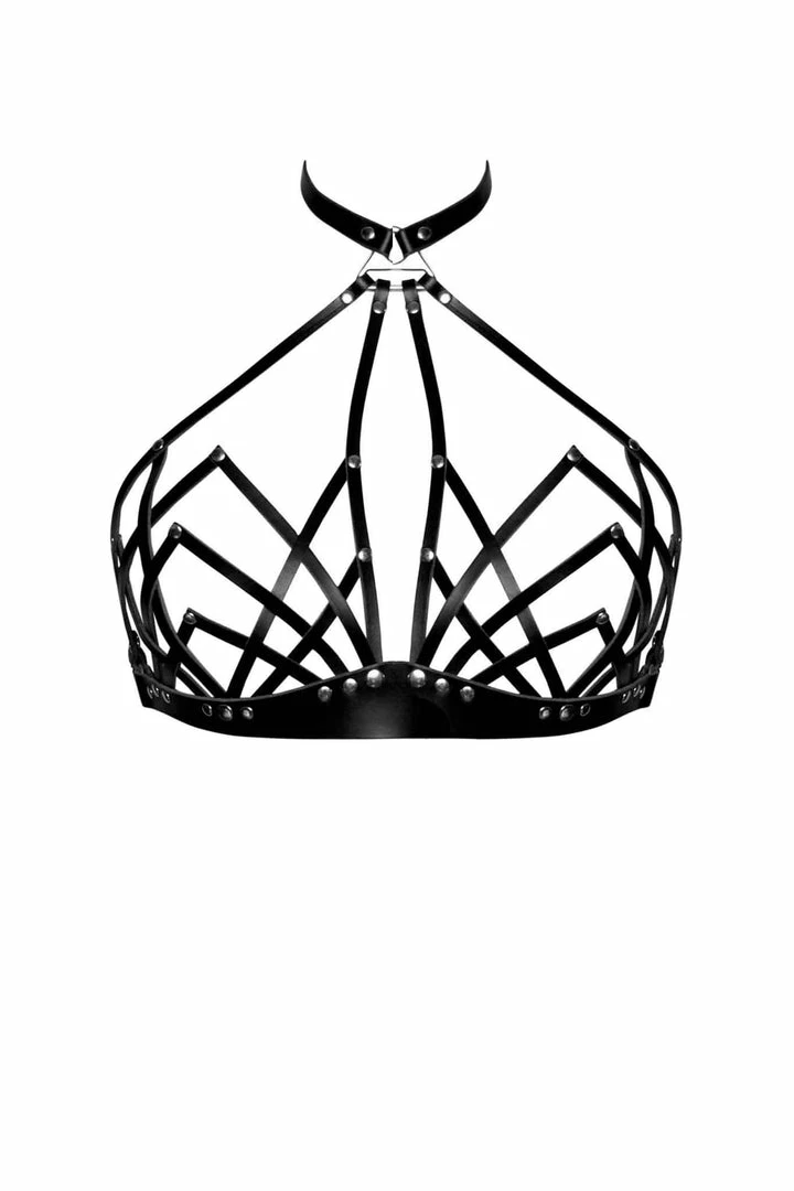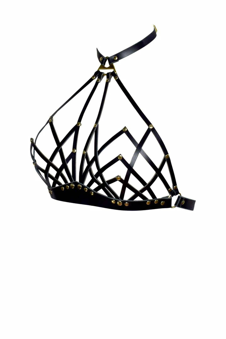 Delicate Art Deco inspired leather halter neck bra with an elegant, architectural design and attached collar detail.