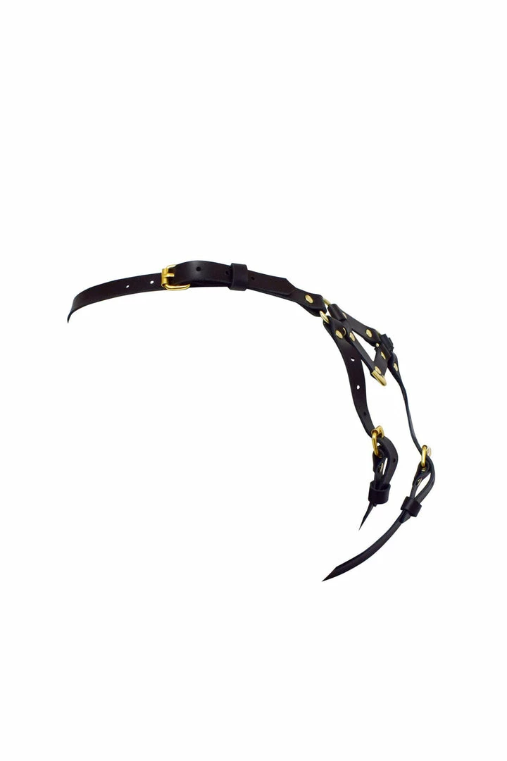 Sexy, delicate black leather frame panty with gold hardware and adjustable sizing. Open crotch design.