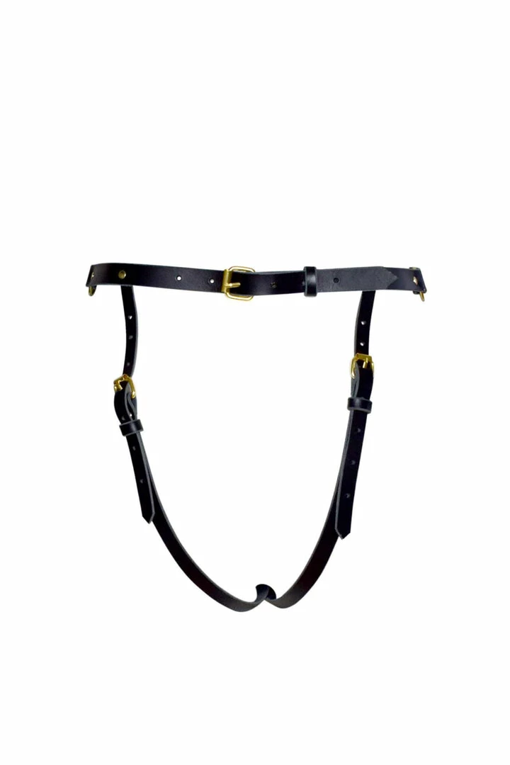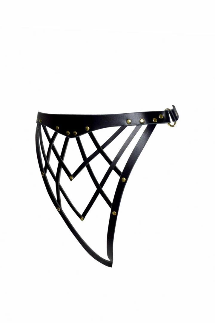 High cut leather bikini with Art Deco inspired design, open crotch, and adjustable waist and leg straps.