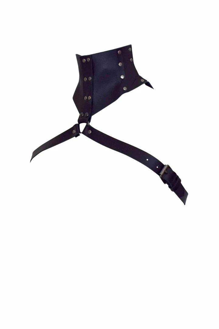 Black leather posture collar harness with gunmetal hardware and adjustable straps.