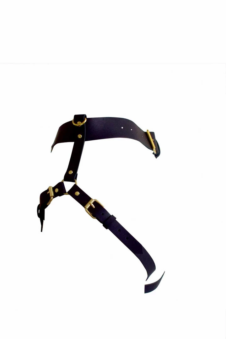 Chunky, practical leather strap-on harness panty with several points of adjustability and removable ring, for use with your favorite toys!