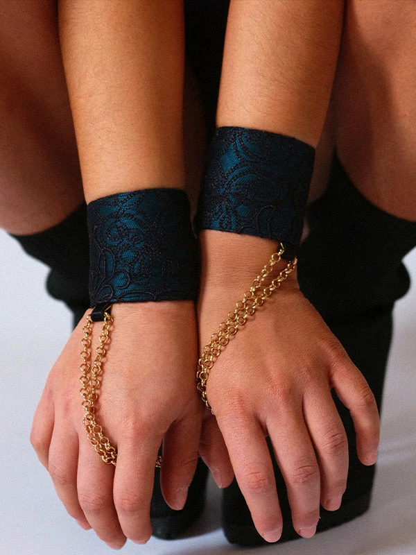 Combining delicate embroidered tulle with a sultry soft blue silk lining creates a sensual bondage experience. While a gold metal linked chain allows you to indulge in enjoyable restraint.