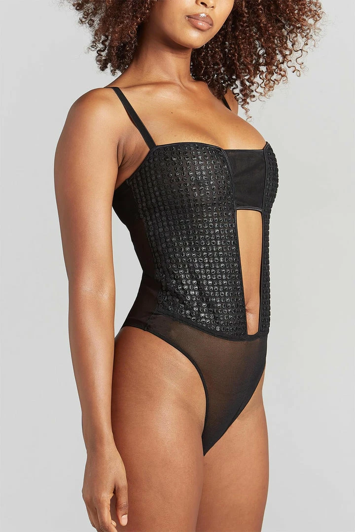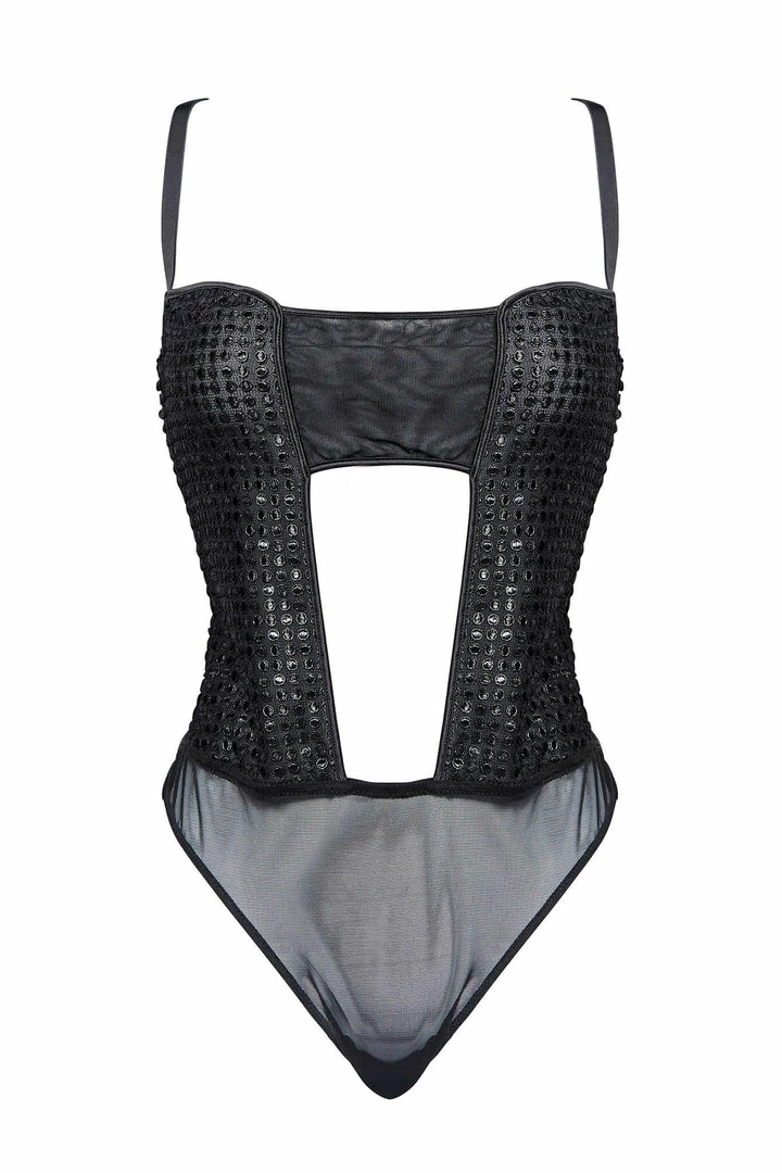 Versatile luxury Melanie is a true celebration of fierce femininity a show stopping; curve accentuating, and thong bodysuit, finished with Italian binding. Designed with a center front opening that exudes sex appeal exposing just enough skin. Side panels of circular embroidery with a calendar sheen finish draw the eyes around the body.