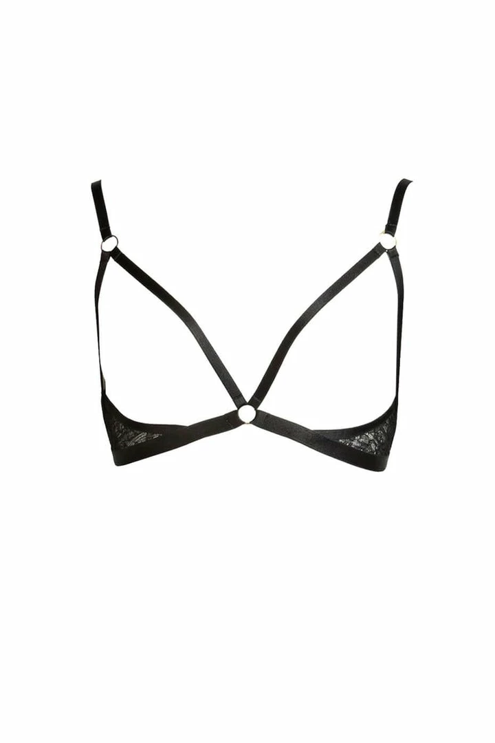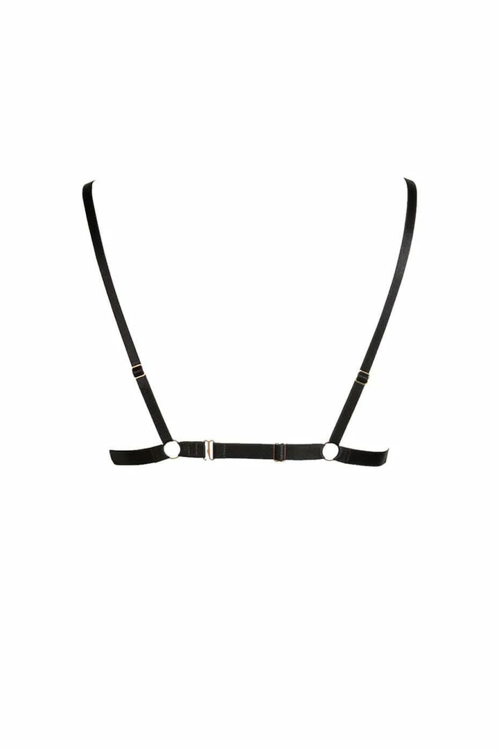 Delicate French Chantilly lace inserts sit just under the bust on this harness bra which is finished with gold hardware and elastic.