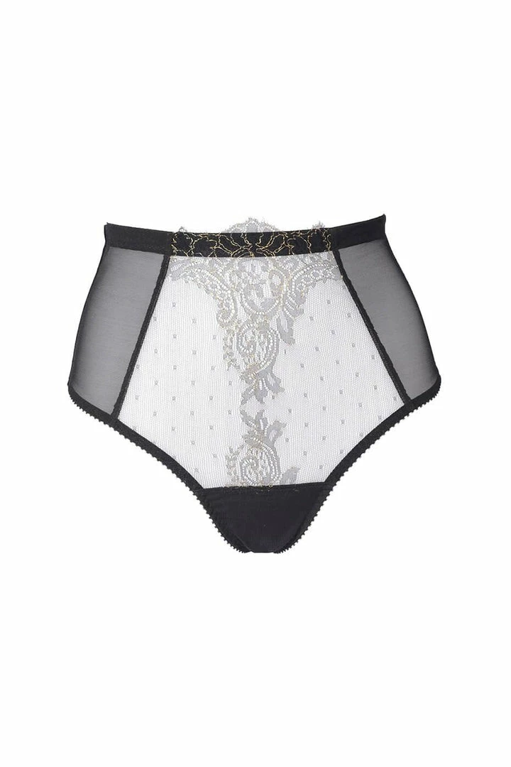 Like all the pieces in the Arabella collection, this high waist brief is a modern twist on a lingerie classic. The gold threaded lace motif stands elegantly at the center of the brief, surrounded by soft powermesh.