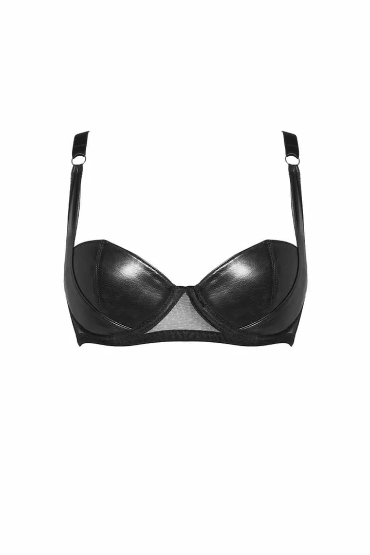 Designed to make a statement, the Nina balconette is a full leather cup bra with overlay panel details and finished with back leather strapping detail.