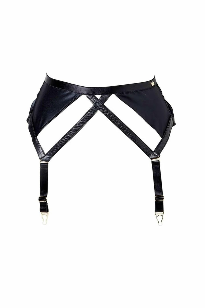 Add the finishing touch to your set with the stunning Jade suspender. Made from the softest stretch satin and bold leather straps, the design of the suspender shows off the signature strapping and cut out details that runs through the whole of the Jade collection. Adjustable suspender straps allow you to create the perfect fit.