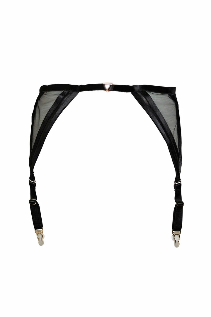 Complete your set with the Mia leather and mesh suspender. Sheer tulle panels contrast with striking real leather panels to reveal a glimpse of what is underneath. The angles of the leather create a flattering shape to show off your curves. An adjustable waist strap at the back allows you to create the perfect fit.
